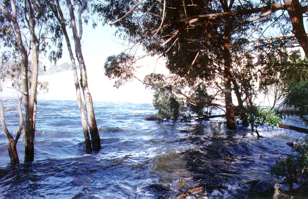 ![]() 627x410 JPG - 159K Approaching the Dam from the New South Wales side. The structure seems partially obscurred, blurred, by the mist rising from the out-flows from the Dam. ![]() 627x397 JPG - 108K A closer view of the Dam structure. Taken 13th October 1996 - 17 gates open. Part of the power station complex can be seen to the left of the picture. ![]() 627x397 JPG - 118K The waters at the base of the dam are a popular fishing spot. Water releases from the base of the dam to the left of the spill-way gates are from the power station. ![]() 411x585 JPG - 103K Looking down from the top of the Dam wall at one of the power station outlets. ![]() 627x397 JPG - 108K Choppy high water at the boat-ramps by the Spillway Caravan Park. The Dam wall is obscured by mist but can just be seen to the right through the trees, small eucalypts which are normally high and dry! ![]() 623x326 JPG - 84K Flood waters on the lowlands downstream of the Weir. ![]() 622x328 JPG - 89K Flood waters flushing the lagoons downstream of the weir. Annual flooding is actually an important part of the life-cycle of Australian Rivers and the river gums. |
