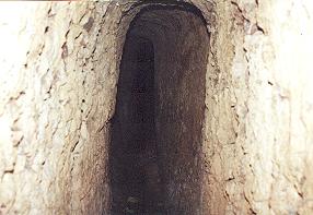 The Starting Point is after arriving at the Silver Creek Caravan Park, in the paddock nearest Beechworth, you will see a small creek running into some large ponds. This is Spring Creek. At the back of the paddock you will see two wooden bridges. One crosses Spring Creek, whilst upstream, the other crosses Silver Creek. The junction of the two streams is in between the two bridges. Cross the upstream bridge, and follow the trail through the "tween streams" and then up some steps and off into the forest. After walking along the track for some 400 metres you will come across two mine shafts Heaven and Hell. Above you can see the photo's of the two tunnels running parellel underground, one on top of the other. Heaven is above Hell, which seems to fit the theory, but contrary to all beliefs, Hell is not full of fire, but is full of water. These two tunnels were used in the sluice mining of the other side of this hill. Water from the Silver Creek was pumped through both these tunnels filling up the large storage "bin" made on the other side. This water was fed through smaller sized pipes creating pressure, and then the miners used the "fire hose" to wash the topsoil off the surface of the hills. You may walk through Heaven, the two entrances are the smallest parts. Most of the way it is about 6 feet or 1.8 metres high, and is about two and a half feet wide, or about .75 metre. You will need a good torch as the tunnel is about 300 metres long and is very dark. There is a small climb over a sandy dirt pile at the other end to get out. Above is the entrance to Heaven, and the photo above right shows looking back along the tunnel towards the entrance from about 50 metres.
