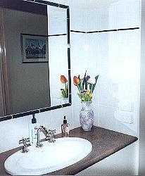 The bathroom has a double bowl washing cabinet and a double spa and shower,