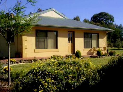 The two stone cottages are set amongst landscaped gardens, overlooking rolling farm paddocks and the Beechworth Hills.