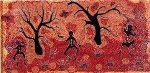 Sometimes granny used to say to us kids, "if you don't keep quiet the m/ook-m/ook will get you" and we use to go real quiet cause this m/ook-m/ook he made a terrible fearsome noise. It wasn't till a long time later that I found out just what this terrible m/ook-m/ook spirit was - it was just a small bird and even then we still wondered how he had the power to carry noisy kids away. And Power, that's what it was - combined with patience, respect and discipline. The old ones knew and respected this power of the life cycle... everything, animate and manimate had a power and even if you didn't understand it you had to respect it... that was part of the learning. Even the smallest bird had a power spirit that wound himself into your life and when you saw a wedge tailed eagle swoop onto a snake and take him way up into the sky and then drop him onto the rocks for the kill - you had to say to yourself "m/ook-m/ook's brother, he's pretty big." The eagle, he's spiritual totem of the Bakandji and when you consider the majority of his head's taken up with his eyes - it's got to mean something. So If you haven't got the patience and the discipline you went hungry, and if you haven't got the respect, you get bitten, clawed, scratched or worse, dead. Talk about fast food - some of this is pretty fast. That's why I got to put this down - all these thoughts and paintings and sculptures - they're me and what my people the Bakandji represent. I was always taught that life was like the path of the echidna - there's these tracks and you don't know whether they're going forward or back - he's tricky - you have to observe, have to have the experience and after you've back-tracked a hundred times, you start to learn, you become that animal, you capture his spirit but you still have to have respect 'cause he is not going to let you do it easy. See out there, there is not much you can't eat - it's like divining - the seasons - seeing what the animals have eaten gives you a clue - like the goanna, he loves eggs so you want him to make a visit, just spread a few broken shells around and he can't resist - terrible curious, he'll check you out. I guess we're all a little bit like that. Sooner or later they all come to the river and my people, the River People - the Bakandji knew this, but the animals, they're pretty smart too - they also know where we are and that's the story, that's the vision, the never ending search for food - food for the body and food for the spirit - the hunter and the hunted - and I want to share some of it with you.