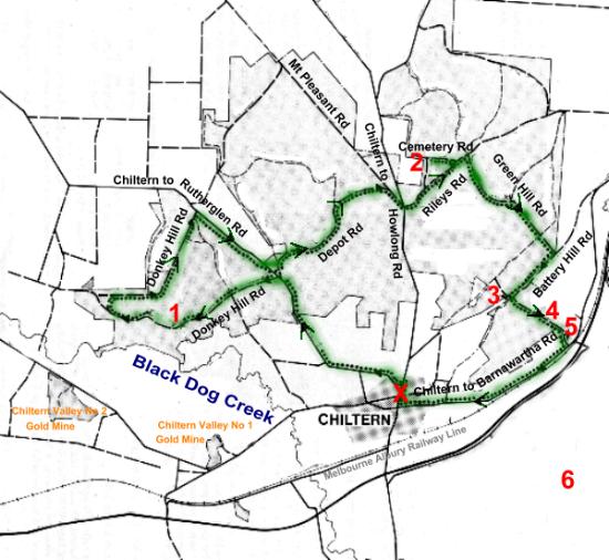 This circular drive starts and finishes at the Chiltern Tourist Information Centre, near the corner of Main and Conness Streets, Chiltern. Allow about one and a half hours for the 25 Km trip, as you will be stopping frequently to see the view or the mines. Better still allow more time and pack a picnic lunch. You will see only a part of Chiltern State Park, but these notes, plus your imagination, will give you a good introduction to the mining history of the area. The drive is along all weather gravel roads, suitable for all vehicles. Drive slowly to enjoy the scenery, and watch out for other vehicles along the narrow sections. The route is marked with signs along the way. Start at the Tourist Information Centre and proceed north along Main Street towards Rutherglen. Turn left into the Chiltern Rutherglen Road and proceed about three kilometres to the Donkey Hill Road on your left. There is a signpost on the road. Turn left into Donkey Hill Road, which is a circuit or crescent shaped road, and follow it all the way back to the Chiltern Rutherglen Road. 1 Donkey Hill As you approach this lookout and picnic area, you travel through Box Ironbark Forest. It has changed considerably since gold was discovered in 1858. For 50 years until the early 1900s the box and ironbark trees were cut to supply timber for the mine and firewood for local people. Since then, timber has been taken for poles and fence posts. Early records show that the original forest consisted of large, well-spaced trees, and a grassy floor. Today the trees are mostly young and straight, and close together. Many of these have developed from coppice growth from the stumps of trees cut down years ago. The most common trees in the park are Mugga lronbark and Grey Box. Both have timber which is extremely rot resistant and tough and which burns well. Mugga Ironbark has black, hard, deeply furrowed bark up to the small branchlets, whereas Grey Box has grey, fine and flaky bark and small branches. There are two separate BBQ facilities with picnic tables at Donkey Hill.