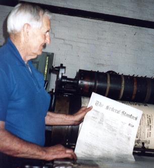 The above photo shows Merv holding up the finished product, a four page newspaper, with exactly the same heading or name, The Federal Standard, as it had in 1859. Visitations The Federal Standard is classified by the National Trust, and the building is opened on certain occasions, such as the Chiltern Ironbark Festival in October of each year. The building and the machinery can be inspected by interested people or groups, and a working display is possible. Contact the Chiltern Tourist Information Centre on 0357 261 611