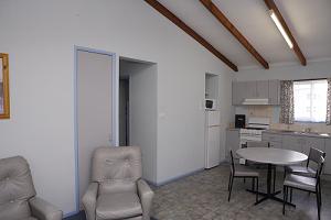 As shown above Borderland has 2 bedroom Villa Units which are fully equipped with full size fridges and gas cookers, large lounge/kitchen areas, full verandah and bed linen, towels, doonas, etc. supplied. Our Deluxe Cabins (below left), and Holiday Units (below right) are air conditioned and heated and have colour TV and a fully equipped kitchen. You may hire Holiday Units with or without bedding. All Deluxe Cabins come with linen supplied (sheets, pillows, towels, doonas etc.). Note the spacious lounge area and modern kitchen facilities, leading back to the double bedroom and ensuite bathroom.