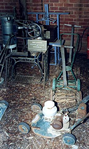 Above is a collection of household implements. In the foreground is an original Victa Moter Mower, a Victor 18 made by Qualcast in Footscray. Behind the Victor are three lawn mowers which had to be pushed by hand, and the turning of the wheels turned the gears which made the cutting blades rotate. To the left of the mowers is a Singer, foot operated Boot Makers Sewing Machine.