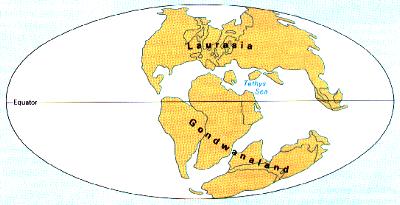 Scientists theorize that the single land mass broke into two major land masses, Laurasia in the northern hemisphere, and Gondwanaland in the southern hemisphere. The above map depicts how the continents may have looked 150 million years ago.