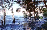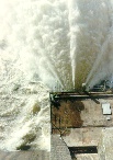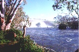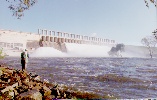 ![]() 627x410 JPG - 159K Approaching the Dam from the New South Wales side. The structure seems partially obscurred, blurred, by the mist rising from the out-flows from the Dam. ![]() 627x397 JPG - 108K A closer view of the Dam structure. Taken 13th October 1996 - 17 gates open. Part of the power station complex can be seen to the left of the picture. ![]() 627x397 JPG - 118K The waters at the base of the dam are a popular fishing spot. Water releases from the base of the dam to the left of the spill-way gates are from the power station. ![]() 411x585 JPG - 103K Looking down from the top of the Dam wall at one of the power station outlets. ![]() 627x397 JPG - 108K Choppy high water at the boat-ramps by the Spillway Caravan Park. The Dam wall is obscured by mist but can just be seen to the right through the trees, small eucalypts which are normally high and dry! ![]() 623x326 JPG - 84K Flood waters on the lowlands downstream of the Weir. ![]() 622x328 JPG - 89K Flood waters flushing the lagoons downstream of the weir. Annual flooding is actually an important part of the life-cycle of Australian Rivers and the river gums. |